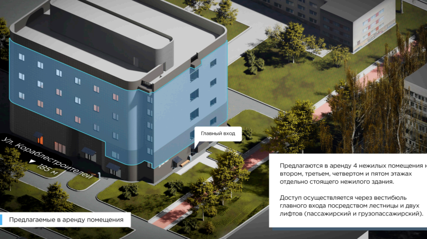 • Доступ осуществляется через вестибюль главного входа посредством лестницы и двух лифтов (пассажирский и грузопассажирский);